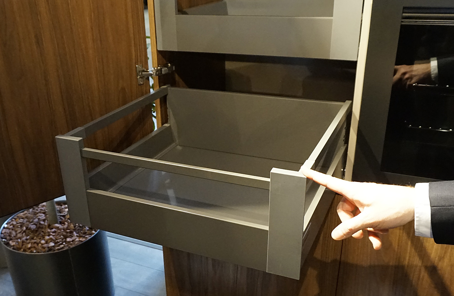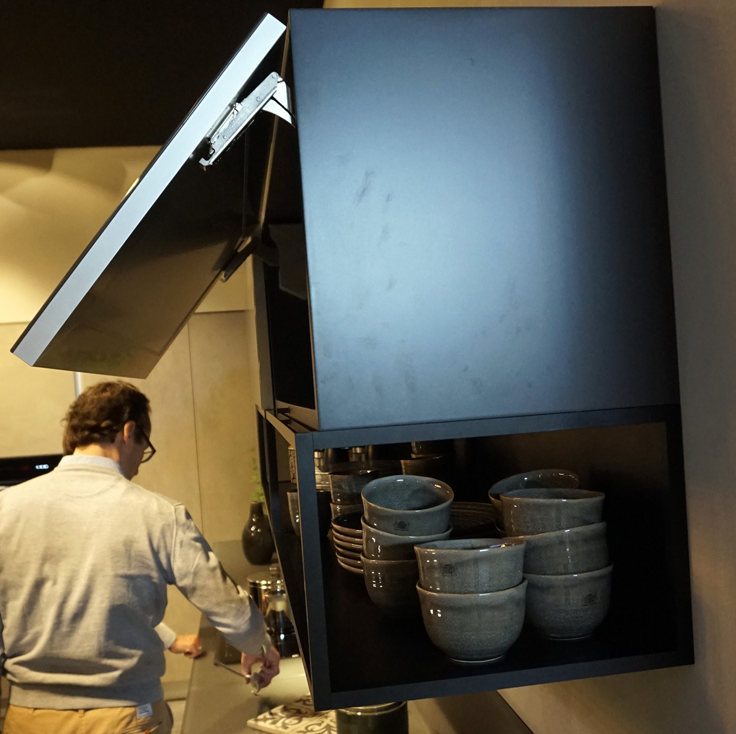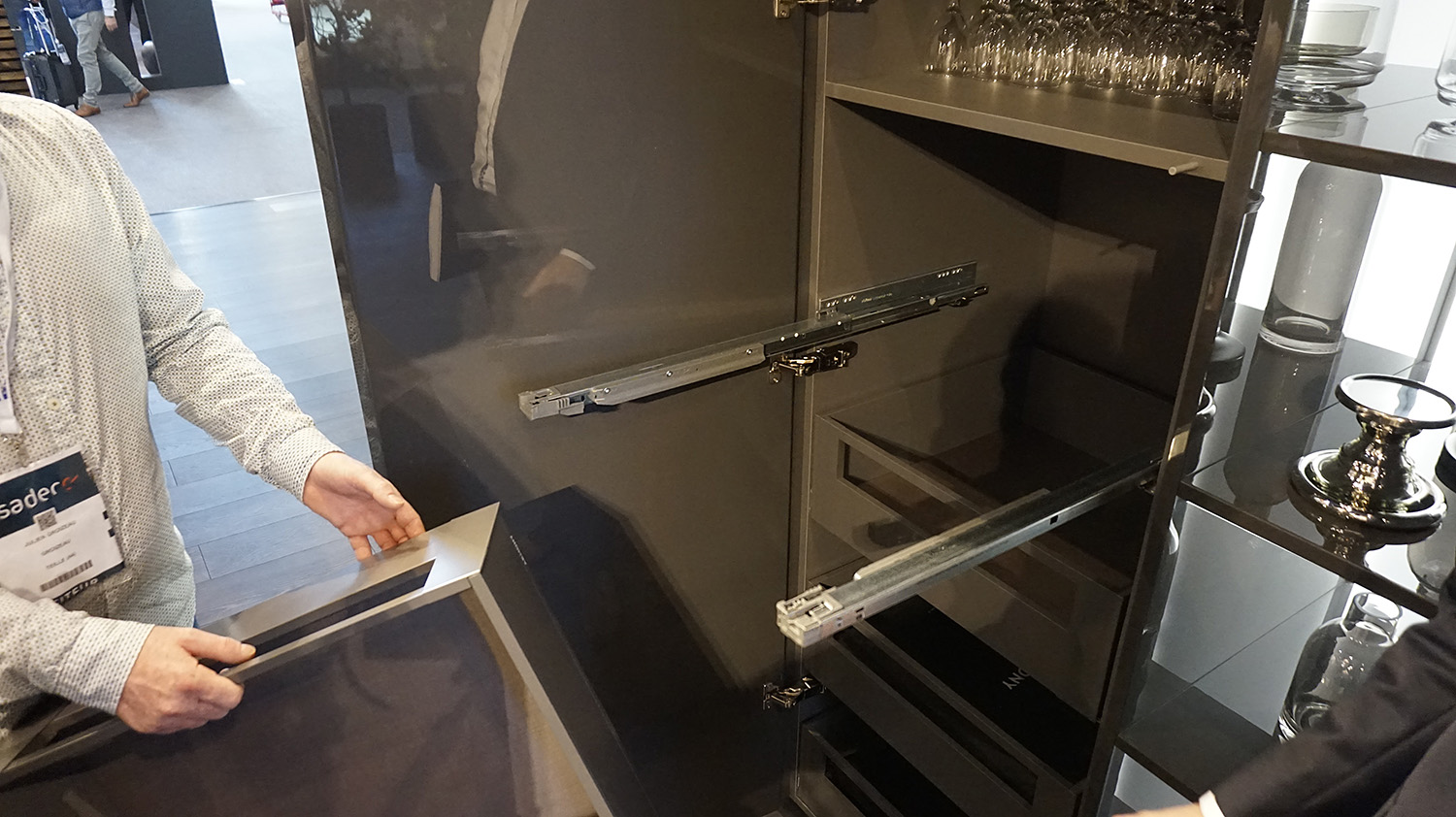 Fabricant allemand de meuble de cuisine sans poignée, Hacker, présentera son modèle d’ouverture ergonomique sans installation électrique.